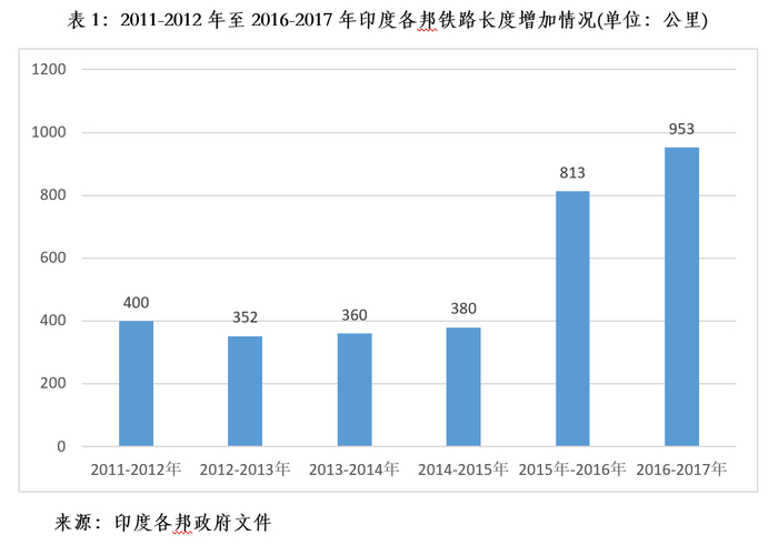 莫迪第一任期采取了新的经济政策——“莫迪经济学”(Modinomics)。为助推这一经济政策的实施,莫迪第一任期加强了印度各邦互联互通的物质性基础设施建设(Physical Infrastructure)。以铁路基础设施建设为例,2016年-2017年这一年里,印度铁路增加的长度是2011年-2012年的两倍多(见表1)。同时还提出了诸如“智慧城市计划”(Smart Cities)、“清洁印度”(Swachh Bharat Abhiyan)等社会性基础设施建设(Social Infrastructure)。