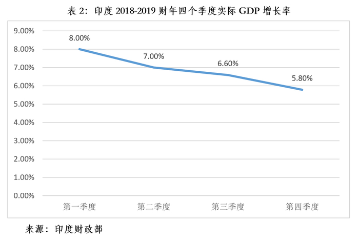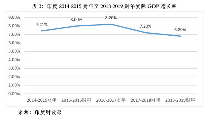 印度目前的经济规模为2.8万亿美元,需每年保持10%以上的经济增速,才能如期实现5万亿美元经济体的目标。然而目前印度经济增速放缓,2018-2019财年(2018年4月-2019年3月)四个季度实际GDP增长率,除明显的减速外,难以看到复苏迹象(见表2)。此外,印度在2018-019财年GDP增速为6.8%,创莫迪执政五年来最低(见表3)。即便如此,印度经济数据的真实性仍遭到外界质疑。印度财政部前首席经济顾问阿尔温德·苏布拉玛尼安(Arvind Subramanian)近期指出印度经济增长率在2011年-2017年间被高估了2.5个百分点,经济数据存在造假现象。