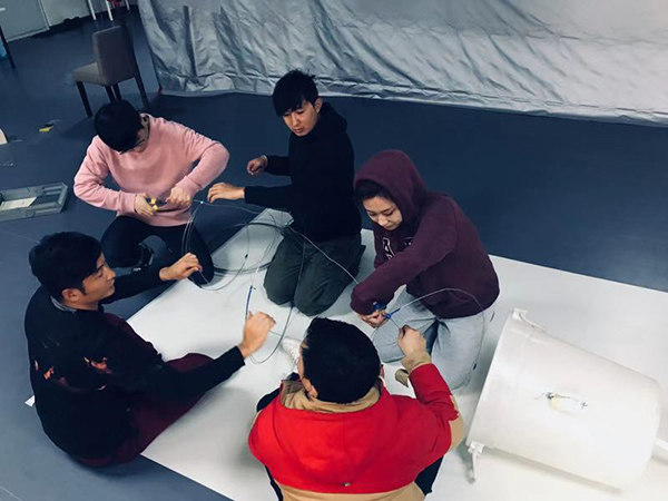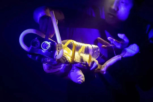 所有前期素材调研结束,团队就紧锣密鼓地制作起道具,崇尚环保的他们搜罗了一大堆日用废旧品,来了一番大改造。最难忘的是,他们要做出潜水员的木偶,大家头脑风暴,最终从收来的废品里找到了微波炉手套、油漆刷子、洗衣机管子、矿泉水瓶子和灯泡底座,拼拼凑凑还真的有模有样。