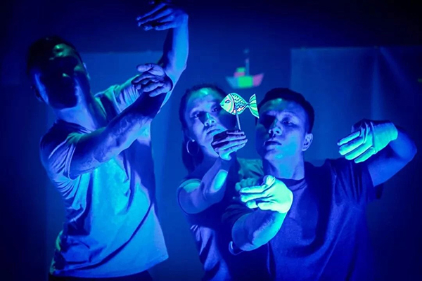 他们想用简洁但有力的方式来演绎海底世界的庞大深邃,这也是刘晓邑一贯坚持的“轻故事,重表演”的创作思路:做2岁以上的观众都能看懂的戏。《海》的核心就是三位舞蹈演员和一名乐手,用沙、水、光、音,结合木偶,以肢体语言讲述了一条不安于枯燥生活的小鱼逃到大海的经历。