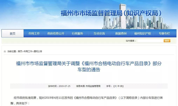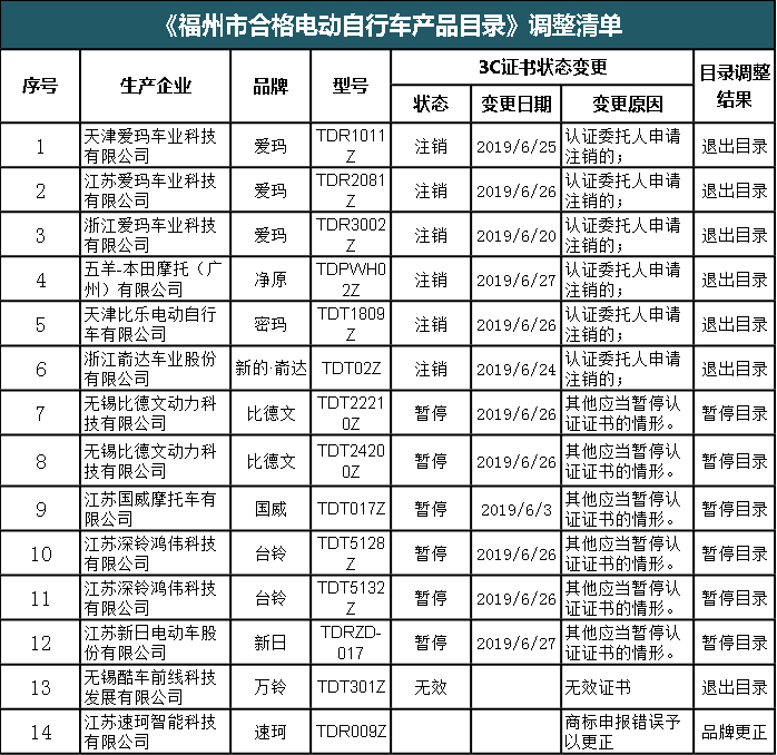 经市政府批准同意,现对2019年4月11日发布的《福州市合格电动自行车产品目录》(以下简称目录)内部分车型进行调整,具体如下: 1、因部分车型3C证书状态发生变化,根据《福州市合格电动自行车产品目录登记办法》有关规定,对相应车型调整如下: