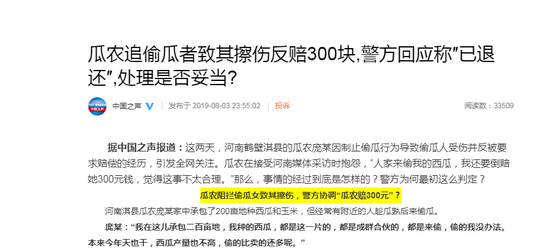 原标题:瓜农追偷瓜者致其擦伤反赔300块,警方回应称″已退还″,处理是否妥当?