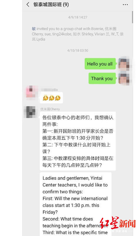 迪亚哥提供的微信聊天记录显示,4月8日,优米圈的”cherry”给迪亚哥安排工作,告诉他每天工作的幼儿园为“若伊的朋友国际儿童教育学园”,地址位于益州大道的银泰城,后经过优米圈的法定代表人胡婵娟向红星新闻记者确认,“cherry”是她的英文名。