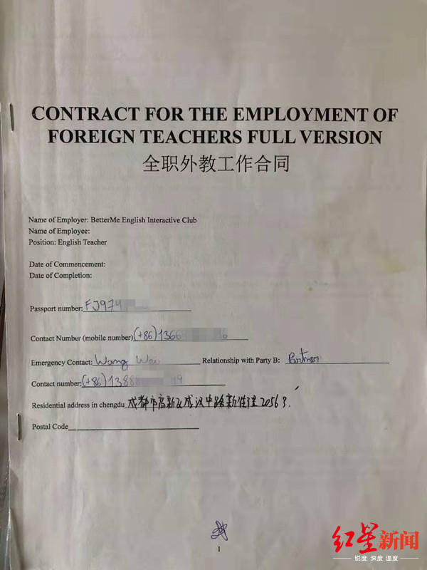 一切谈妥。4月6日,两人匆忙从昆明赶到成都,在位于高新区新街里的优米圈亲子成长俱乐部与该公司代理人张敏签了中英文双语《全职外教工作合同》。