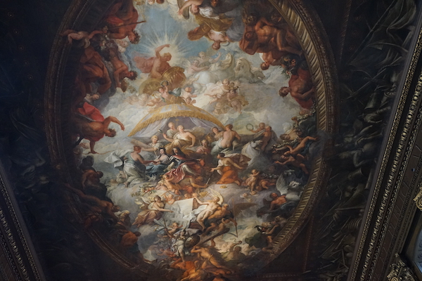 当我踏入这座大厅时,高耸又辉煌的楼梯间已经足以治好我的颈椎病,而一转进大厅,眼前景象更以其繁复和庞大的规模让人震撼。画家所处时代的英国王室,“光荣革命夫妇”威廉和玛丽的形象处于天花板正中央,各式各样的西方神话中的神祇、天使和仙女们围绕着她们。