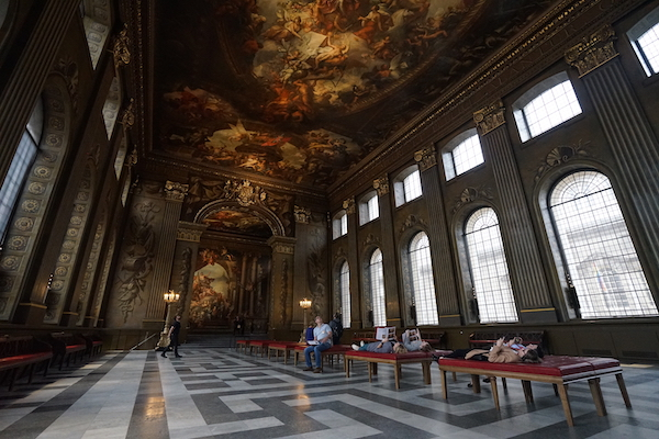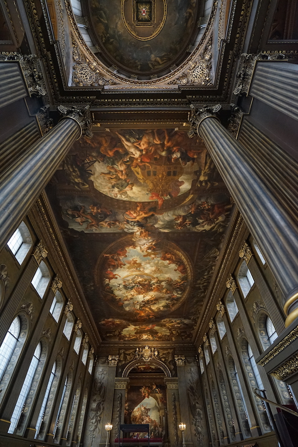 这里算是格林尼治的最新地标了,修复工程花了整整两年,直到2019年4月才正式重新开放。因为其极其辉煌的壁画,它也被称为“英国版西斯廷教堂”。1705年,绘画大厅作为刚刚落成的皇家水手医院的餐厅第一次开放,当时它还不是“绘画”大厅。从1707年,画家James Thornhill——英国头一位以艺术家身份被授勋的爵士,可以说是埃尔顿·约翰等人的先驱了——开始负责这座大厅多达四千平方米的壁画绘制,这项工作,整整花了他19年时间。