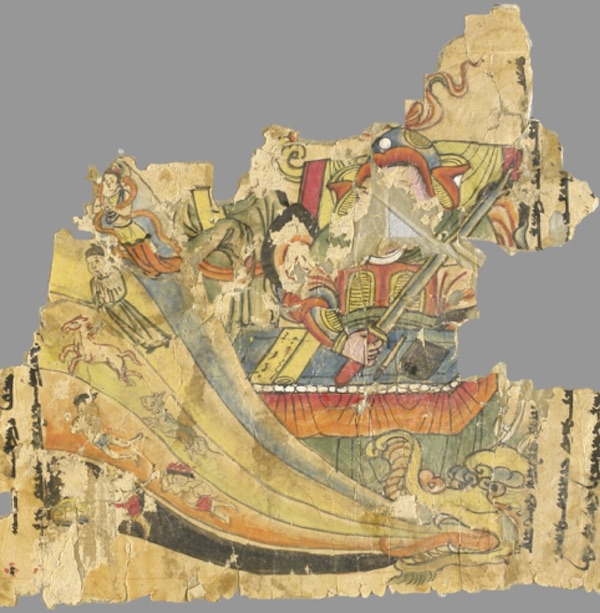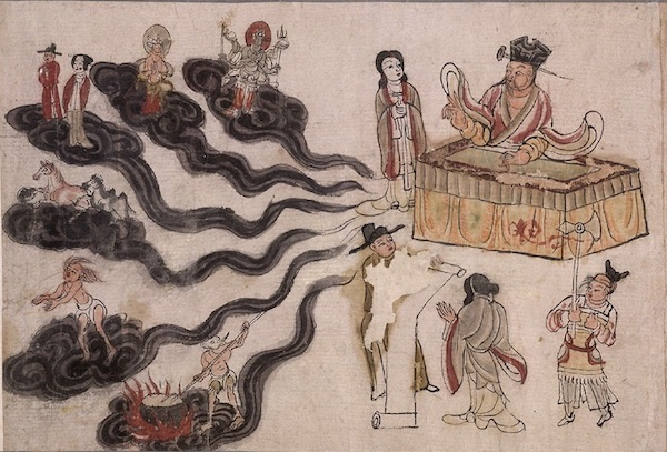 我在研究过程中还发现了一个有意思的现象,古汉语的书写方向是从上向下、从右向左,展卷方式也是以右端为先,而回鹘本《十王经》插图里的人物都是从左端打开卷子,循序向右阅读,后来我才明白过来,这与回鹘语的书写方向有关:回鹘文与满文一样,由上而下、由左而右,直行书写,正好与古汉语书写方向相反。回鹘语本子做得很精,细节考究。