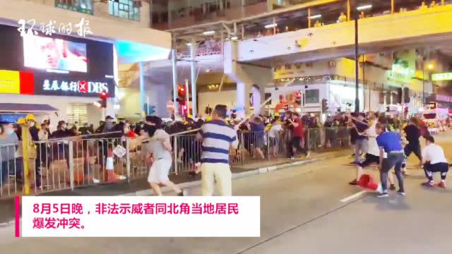 [非法示威者与香港北角当地居民爆发冲突]香港北角5日晚8时许,非法示威者在街头同当地居民爆发冲突,场面非常混乱。据港媒报道,大批非法示威晚上拆毁铁围栏,堵塞前往鲗鱼涌方向的路。在明园西街一带,一些当地居民手持棍棒、藤条聚集在一起,同示威者爆发冲突。