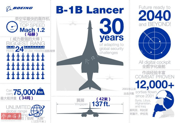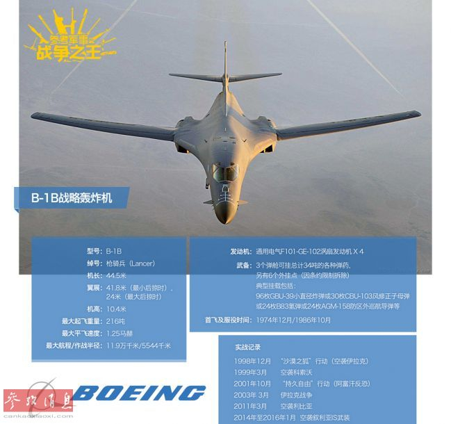 图为美国波音公司(罗克韦尔航空部于1996年被波音公司收购))制作的B-1B数图,其中从2001年至2015年1月以来,B-1B机群的总出击架次数超过了1.2万架次。据美军统计,在2014年8月至2015年1月,针对”伊斯兰国“极端组织的空袭行动中,B-1B的投弹量占到了美军战机投弹总量的80%。
