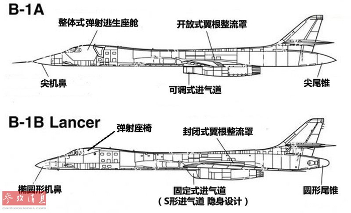 按美空军的要求,罗克韦尔公司直接利用2架B-1A原型机改装为B-1B测试机,并表示,B-1B 与 B-1A 通用率达到了 85%,攻击航电系统与 B-52H 的通用率达到90%。图为B-1A与B-1B的外形对比,两者整体区别不大,经过改进后的B-1B,尽管最大平飞速度降至1.2马赫,但综合性能更加成熟(特别是针对当时苏联新型雷达的电子战能力),而且可靠性更强。