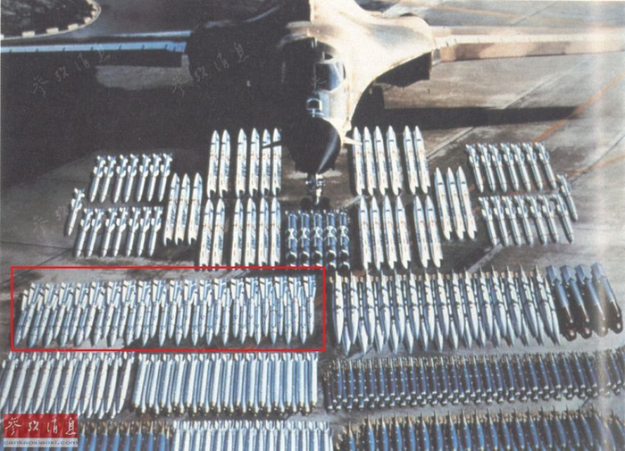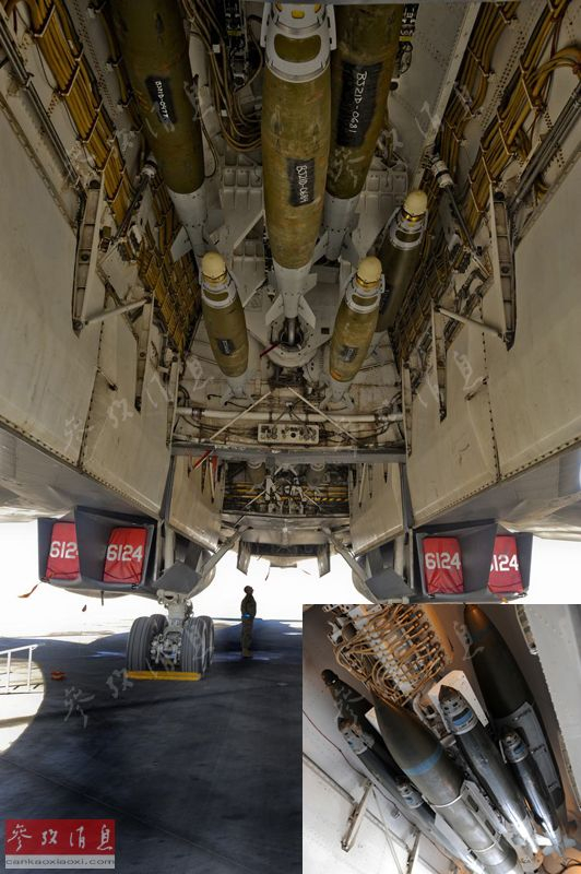 B-1B在强化了巡航导弹搭载能力的同时,还具备搭载大批不同种类的对地攻击弹药的能力。图为B-1B的地面武器展示,除能搭载与B-52相同的旋转武器发射器(图中)外,B-1B的整体载弹量要高于B-52。图为B-1B进行地面武器展示资料图。