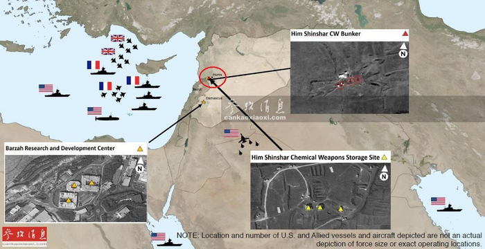 图为美国国防部放出的美英法三国联军空袭叙利亚目标示意图,其中B-1B轰炸机群是从靠近叙利亚南部的空域发射了19枚AGM-158 JASSM隐身巡航导弹,打击了位于图中红圈标出的霍姆斯地区附近的两处“化武”设施。