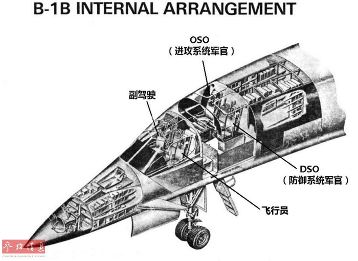 随着航电技术的进步,与B-52不同,B-1A的乘员数量进一步精简,采用4人制机组,分别是正、副飞行员,进攻系统军官(OSO)和防御系统军官(DSO)。图为 B-1B的机身前部剖面图。