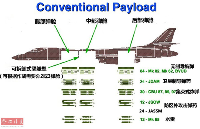 B-1B“枪骑兵”是美军现役武库中,载弹量最大的轰炸机, 图为B-1B的弹舱挂载配置示意图,该型机共有3个弹舱(其中前部的两个弹舱可根据需要合二为一,搭载重型炸弹),内部载弹量达到34吨,可搭载美空军武库中几乎所有的弹药,从自由落体核弹、核巡航导弹到常规航弹,卫星制导弹药,甚至反舰导弹、水雷均可囊括。