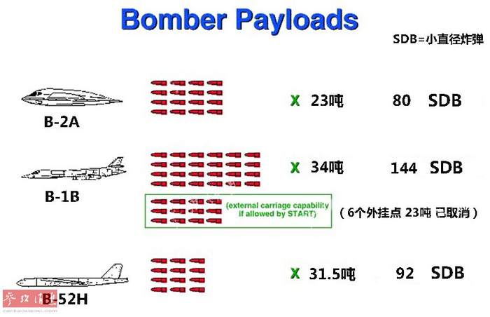 图为B-1B、B-52H和B-2三种轰炸机的挂载能力对比,可见B-1B的载弹量要大于另外两种轰炸机。
