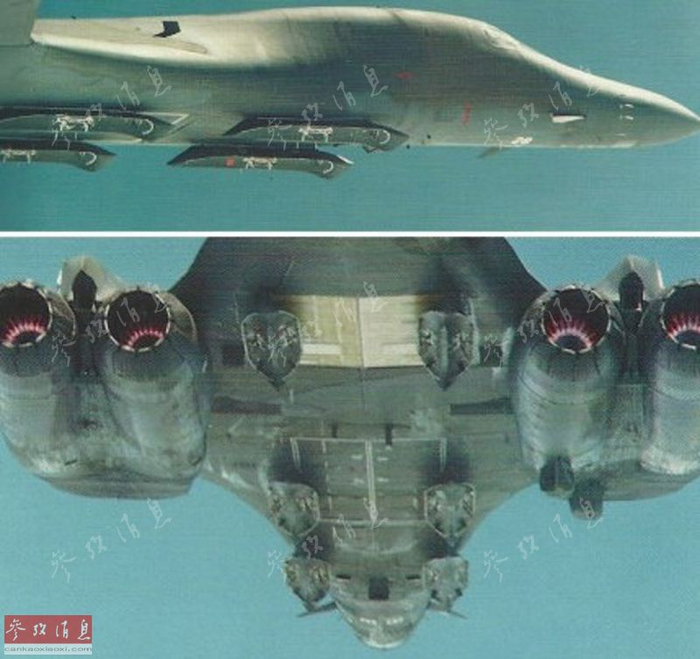 按原设计,B-1B在机身上实际还有6个外挂点,载弹量达23吨。图为B-1B挂载ACM巡航导弹外挂架进行飞行测试。但后来由于美苏《削减性战略武器条约》的相关规定,B-1B取消了外挂能力,另一大原因是因为外挂武器会大幅影响飞行性能。