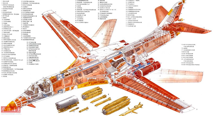 B-1A的另一种革命性设计就是主翼采用了可变后掠翼布局(变后掠翼范围为15度至67度),可兼顾高速性能和低速起降性能,这使B-1A不仅具有优秀的超音速飞行性能(最大平飞速度2.2马赫),而且还能在无法部署B-52的机场起降(B-52的最大起飞滑跑距离为2900米,B-1B为2530米)。 图为B-1B的彩色剖面图。