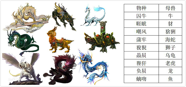 《西游记》中西海龙王还向孙悟空解释“龙生九种,九种各别”,它妹妹生有九个儿子小黄龙,骊龙,青背龙,赤髯龙,徒劳龙,稳兽龙,敬仲龙,蜃龙,小鼍龙。书上还提到了蟒龙、倚海龙、冷龙、火龙、蛟龙。我们可以看到,龙族的血统并不纯。为什么会有这么多龙,是因为古人认为龙性至淫。早在《西游记》之前,大文豪李东阳《怀麓堂集》就提到了“龙生九子不成龙”的现象,九子分别为:老大囚牛、老二睚眦、老三嘲风、老四蒲牢、老五狻猊、老六赑屃、老七狴犴、老八负屃、老九螭吻。