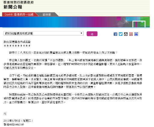 特区政府批评示威者罔顾法纪及有组织的行为,不仅剥夺其他市民上班的权利和日常生活的自由、严重影响经济活动,“其逐步扩散及急剧升级的暴力亦令人发指,正将香港推向极为危险的边缘,特区政府予以强烈谴责。”