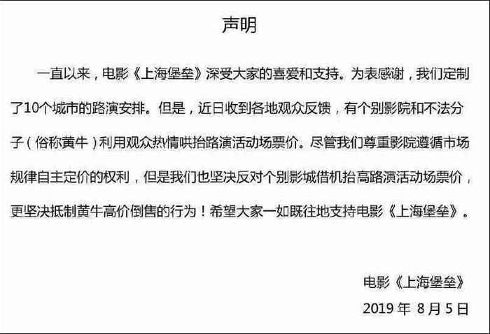 5日下午,电影《上海堡垒》官方微博发布声明称“天价电影票”系个别影院和不法分子(俗称黄牛)利用观众热情哄抬路演活动场票价,坚决反对抬高票价,抵制黄牛高价倒售的行为。