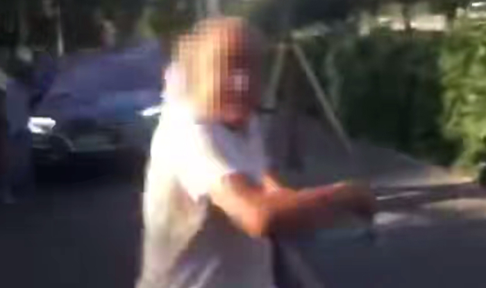 逆行老人欲逃离现场,被私家车主拦住。视频截图