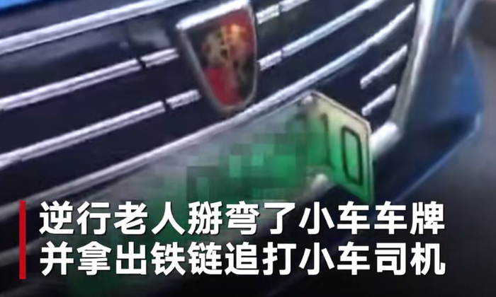 逆行老人掰弯私家车主的车牌。视频截图