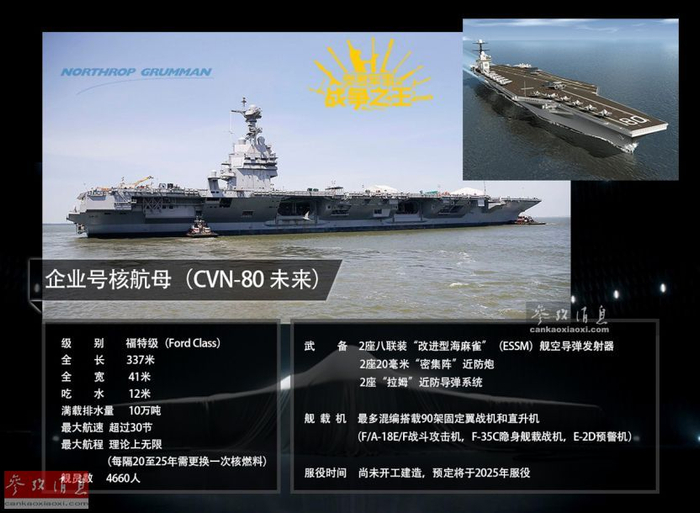 据美军公开资料,“企业”号(CVN-80)将成为福特级3号舰,目前虽还未开工建造,但美海军已提前为其预留了舷号。其配备有4台电磁弹射器,将搭载F-35C隐身战机和无人战机,小图为服役设想图。