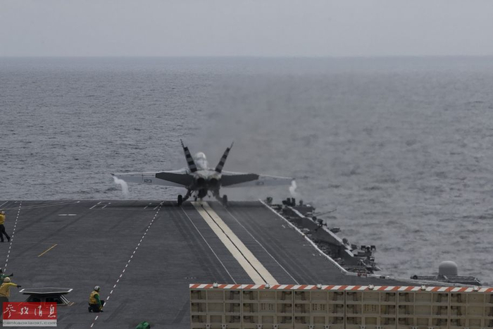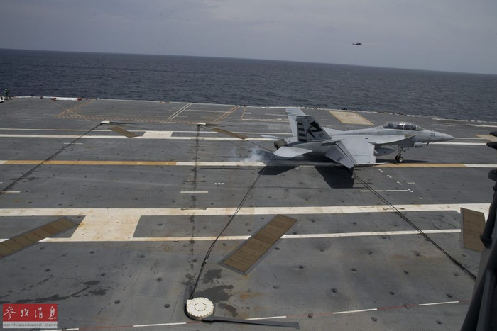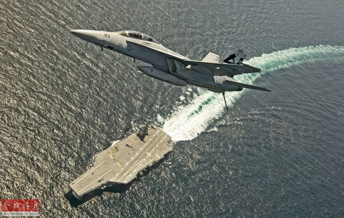 图为F/A-18F在飞越“福特”号上空时,放下尾钩,也是各国海航部队舰载机通用的一个致敬方式。