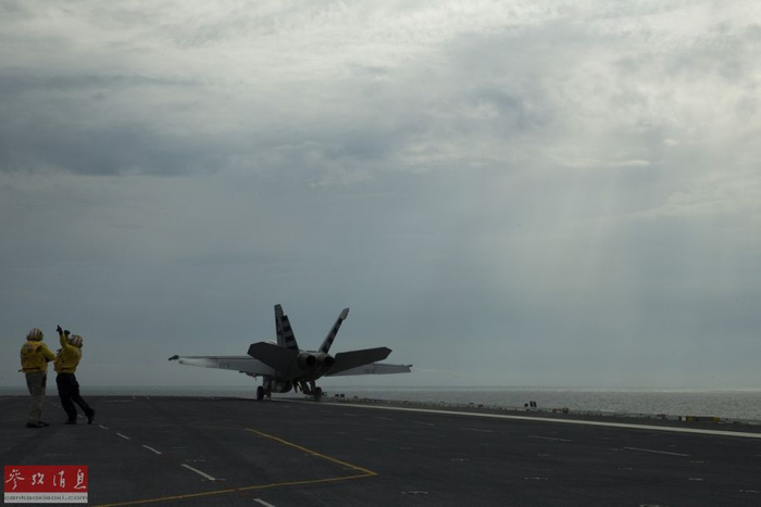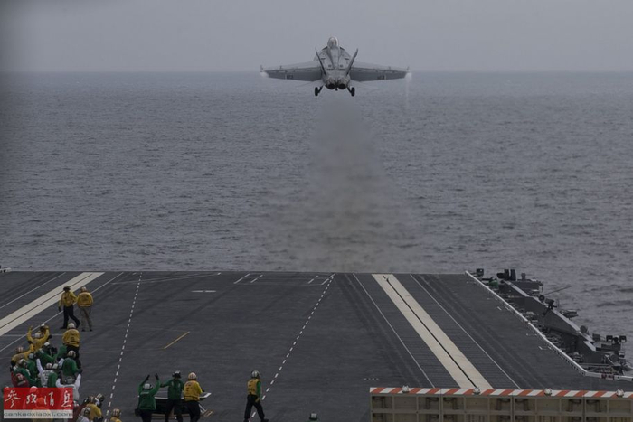 图为F/A-18F战机成功利用电磁弹射器升空,成为了第一架从“福特”号航母上弹射起飞的战机,可见甲板上的美军地勤人员都在欢呼。