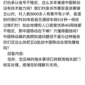 消费者“用户7275138449”在8月14日向黑猫投诉平台再次反映:“本身投诉过泉州移动造假,为什么都是通过泉州客服回复??我问我在黑猫平台补充的证据有没有看?他们也直接回复没有.那中国移动你们在黑猫平台都在忽悠消费者吗?”