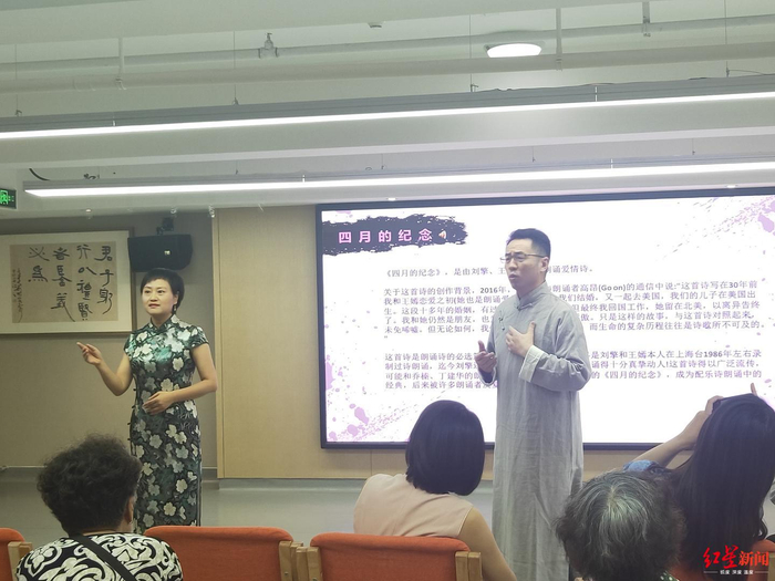 除此之外,吴晓芬朗诵《鹊桥仙·七夕》、安冉朗诵《诗经·汉广》、易杉朗诵自创诗《新娘》、胡马朗诵《樱花,请暂时不要开放》、李龙炳朗诵《窗口》、戴长伸朗诵《我们去摘樱桃》、海光、王茜合诵近代诗《四月的纪念》《信仰》……古代与现代诗歌交融,风格各异的朗诵方式把这场活动推向高潮。