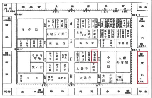 唐代长安皇城内的礼部南院(左红框)和皇城外的崇仁坊(右红框)
