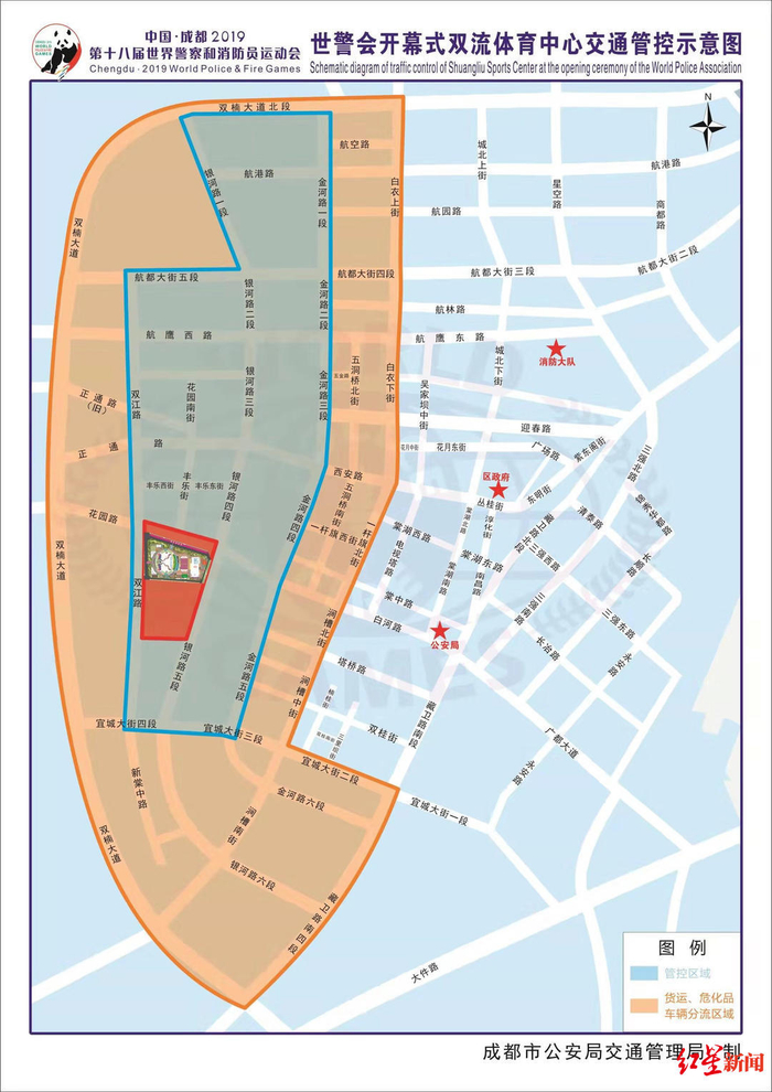 8月8日,第十八届世界警察和消防员运动会将在成都启幕,开幕式将在成都市双流区体育中心举行。为确保开幕式期间的道路交通安全、畅通,交警部门对双流区部分道路实施临时交通管理措施。在8月8日开幕式当天,成都双流区体育中心周边将实施2层管控,管控时间从当日下午2点至晚上11点。8月7日,成都双流交警大队民警来到双流区龙桥北路提前为市民出行支招。