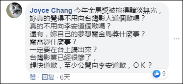 在留言评论区,有网友指责她要为金马奖“黯淡无光”负责,直言傅榆“欠李安一个道歉”。