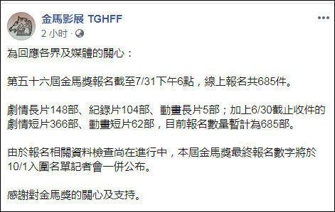 据官网介绍,这届金马奖颁奖典礼将于11月23日举行,各类影片报名日期为6月3日至7月31日。截至31日下午6点,主办方共收到685部报名,其中剧情长片148部,较去年的228部减少了三分之一,为金马影展近四年来最低。