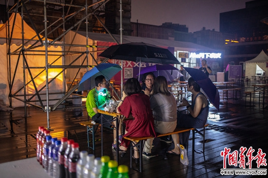 8月4日晚8点,北京东四环外751D·park北京时尚设计广场,参加北京文创产品交易会“月下嗨皮”夜市活动的一桌食客冒着雨喝酒聊天。这个夏天,一系列繁荣夜间经济的举措正在让北京的夜晚越发立体、多彩。