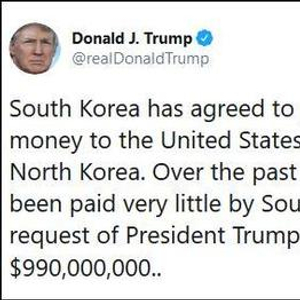 7日,特朗普在推特上称,“韩国已经同意向美国支付更多的钱,以防御朝鲜。过去几十年里,韩国(在防务方面)支付给美国的钱很少,但在本总统的要求下,韩国去年给了9.9亿美元。”