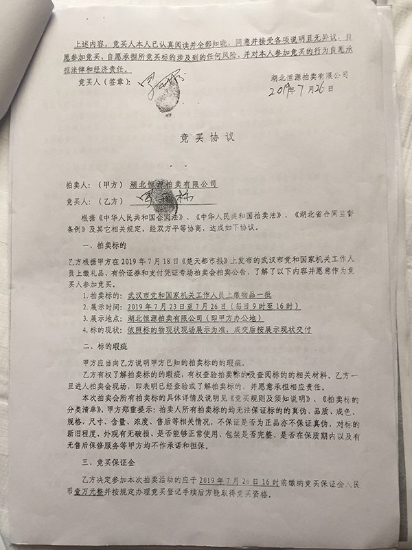 罗程说,7月26日,他从朋友处得知武汉市将有一场党政机关工作人员上缴礼品拍卖会,遂从浙江赶到武汉,并于当日下午向恒源拍卖公司缴纳了1万元保证金,签订了竞买文件。