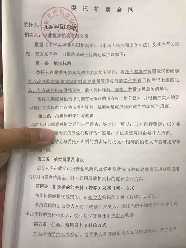 澎湃新闻注意到,恒源拍卖公司曾于7月18日发布“武汉市党和国家机关工作人员上缴礼品、有价证券和支付凭证拍卖公告”。