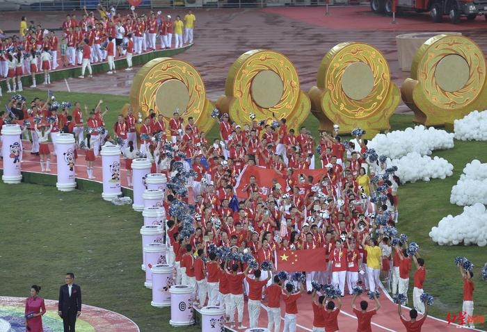 每一支队伍亮相之后,60位熊猫引导员引导运动员登上观众席前搭建的梯台到指定位置就坐。最后入场的是中国队。待中国队全部走上“欢乐大道”和“荣耀大道”站定后,五洲同聚,掌声雷动,现场氛围达到最高点。