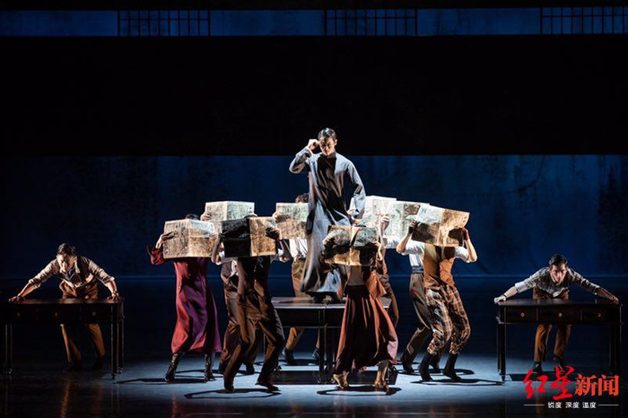 故事主线没变,细节却诸多调整,人物也和原版电影有一定出入,如此多的改编让观众很难从一开始就进入状态。上半场演出巧妙地顾及到了这一难点,主要人物一一出现,传递情报、互相怀疑,彼此小心翼翼地试探,台下观众也看不出太多所以然,甚至在开篇一闪而逝的文字中,都没能完全对应每个演员的身份,只能饶有兴致地猜测。集中在上半场的多场精彩的群舞化解了情节人物复杂的观感。报馆员工写稿印刷报纸的紧张舞蹈,伴随着《渔光曲》徐徐展开的旗袍舞,展现老上海里弄72家房客的生活群舞,撑着黑伞在雨中而行的黑衣人群舞……一段段群舞舞蹈风格迥异,构成了1940年代老上海风情的底色,也成为上半场演出令人难忘的亮点。