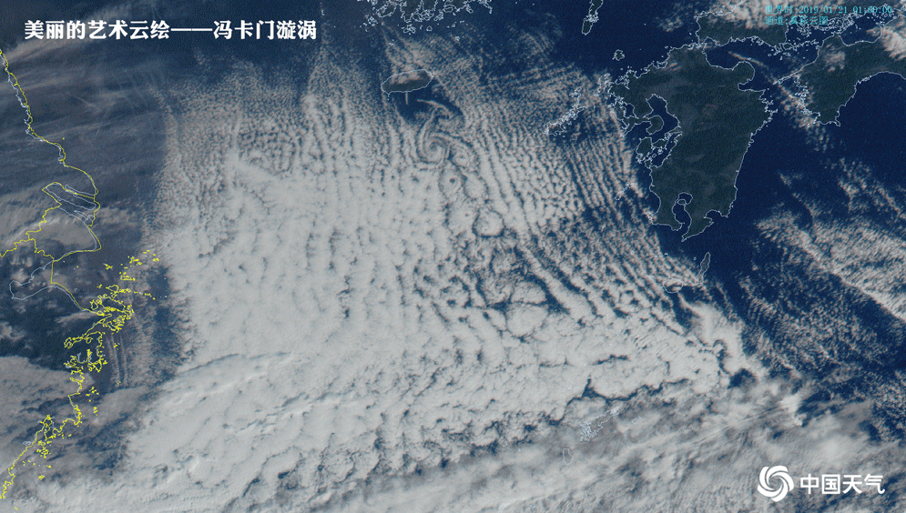 “冯卡门漩涡” 通常被称为卡门涡街,是流体力学中重要的现象,如水流过桥墩、风流或海洋气流受阻于岛屿或多个岛屿时就会形成。2019年1月21日,风云四号气象卫星就监测到了韩国济州岛以南海域和日本九州岛南部海域出现的“冯卡门漩涡”。这些云看上去就像被打了孔一样,实际上它们是很自然的被风巧妙地吹出漩涡的形状。太空视角的 “冯卡门漩涡”更像是一幅美丽的艺术云绘,颜值爆表。