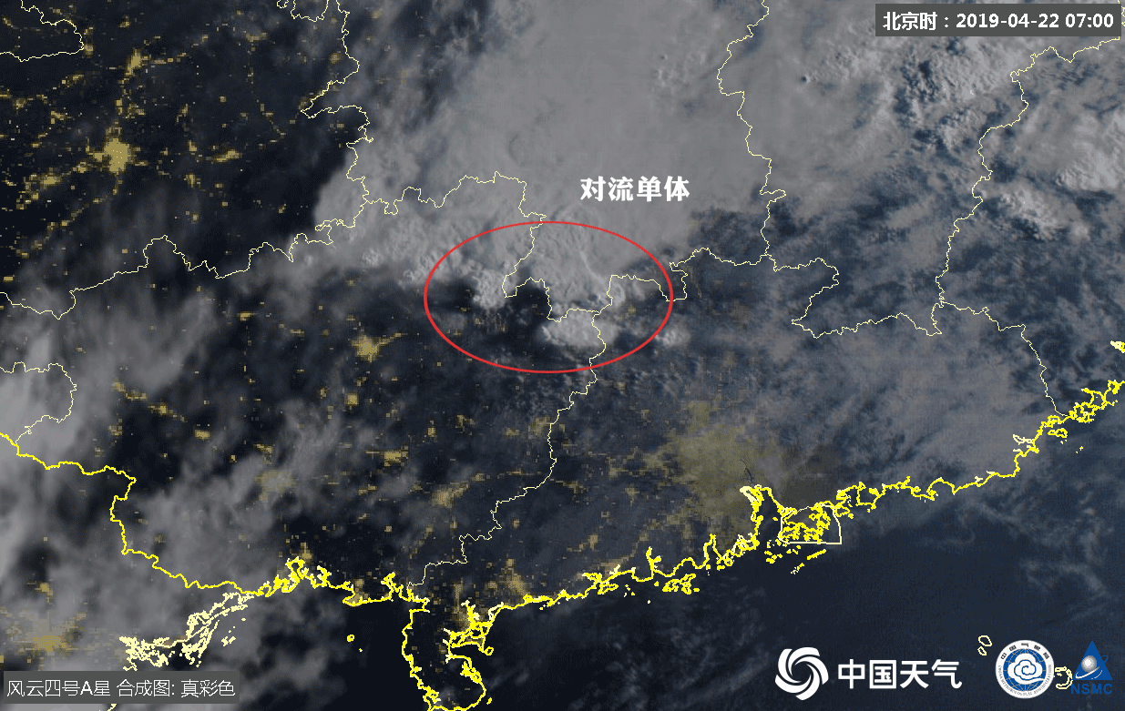 这是2019年4月22日7时-9时的卫星云图,可以看到在广东、广西北部,有一个个对流单体在活动。它们就像青春痘一样,由于太阳在东边,云的西侧能看到明显的阴影,这说明对流向上发展较高。一般情况下,这种云下面的天气往往是雷雨交加,非常恶劣。