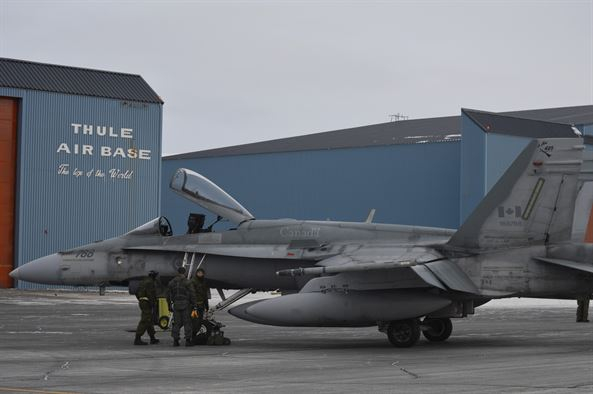 资料图片:临时在图勒基地休整的加拿大空军CF-18战机。(图片来源于网络)