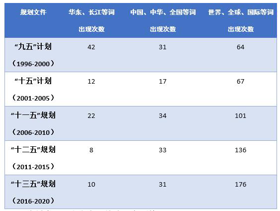 上海历个五年规划大数据分析显示,“华东、长江”等词在五年规划中都有相应体现,“中国、中华、全国”等词在每一轮规划中都保持较高的出现频次,“世界、全球、国际”等词的使用次数越来越多。这表明上海的发展历来就是“放在中央对上海发展的战略定位上和放在全国发展的大格局中”,同时,上海也更加注重在国际视野下谋划未来发展。