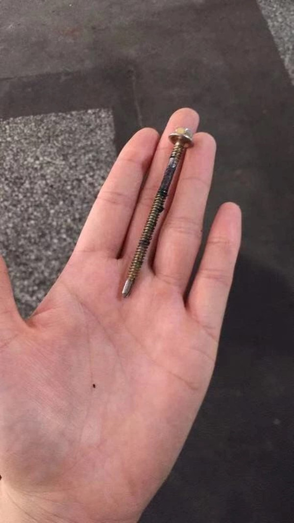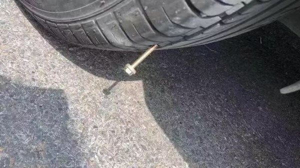 现场一名业主愤怒地告诉记者,并递过来一根螺丝钉,记者观察发现这根螺丝钉大概有七八公分,对方称如果是正常行驶中的车辆是很难将这根螺丝扎进轮胎。