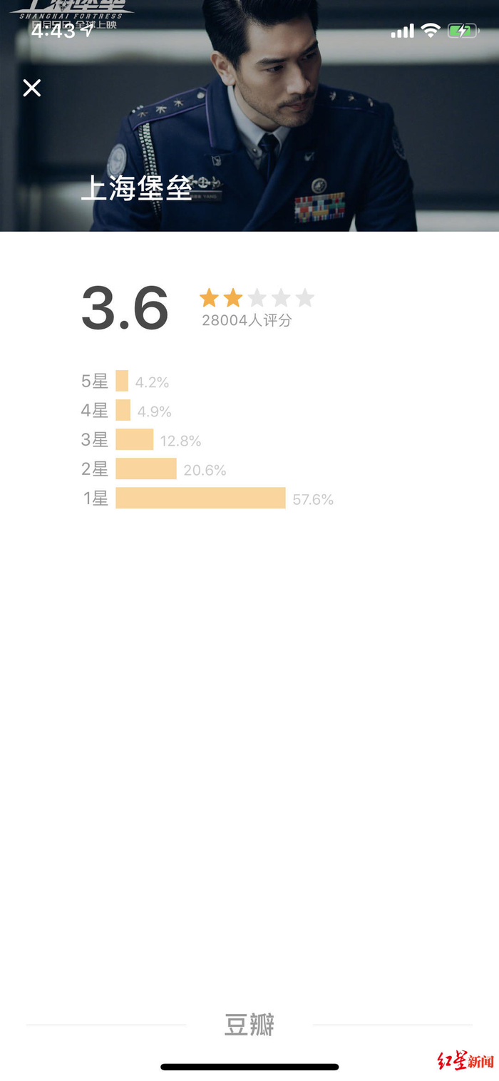 影片上映后遭遇差评,截止记者发稿时,《上海堡垒》豆瓣评分仅为3.6分,57.6%的观众为影片打出了一星。对此,红星新闻记者联系到电影的宣传方,截至目前,他们对此事没有做出回应。