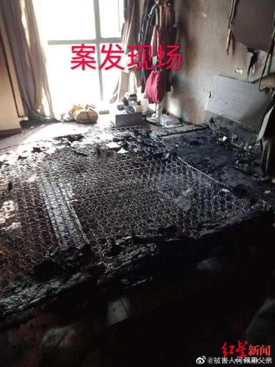 根据何小霜父亲微博发布的一张案发现场照片,红星新闻记者看到,卧室内的床被烧得漆黑,整个房间内均是被火烧毁的痕迹。