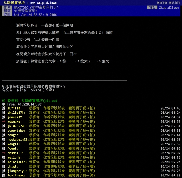 从这群青年人的对话中,magician才知道PTT(批踢踢实业坊)。