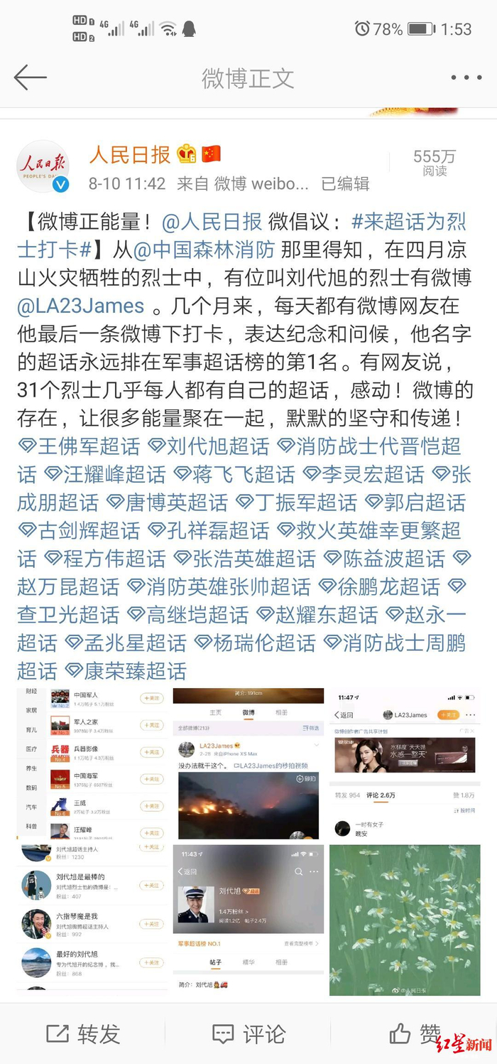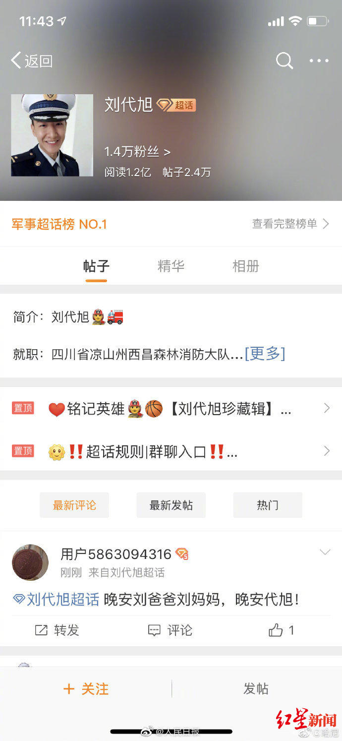 来超话为烈士打卡!木里火灾牺牲英雄刘代旭排军事超话榜第1名